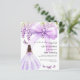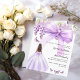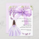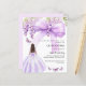 Ein eleganter weißer Hintergrund, mit einem großen Lavendel, lila Bogen, Wisteria-Blume und einem Mädchen in einem Kleid dekoriert. Personalisieren und fügen Sie einen Namen und Party-Details hinzu. 1 Blatt = 1 Einladung mit Druckkante bis Kante.
