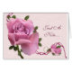 Eine schöne Lavendel-Rose mit Blätter, gefallene Blumenblätter, Band und ein Goldherz bezaubern. Eine reizende zu jedermann zu senden Anmerkungskarte.