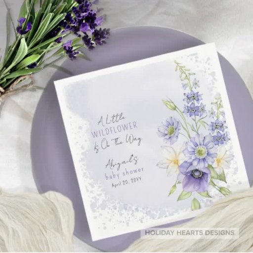 Hübsche Lavendel-Wildblumen auf einem Aquarell-Spritzer-Hintergrund sind die perfekte Kulisse für Ihr Baby Sprinkle Party Accessoires auf diesem "A Little Wildblume Is On The Way" Babysprinkle-Design. Composite Design von Holiday Hearts Designs.