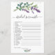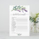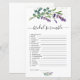 Word Scramble Brautparty Game. Dieses Design zeigt eine Aquarellillustrierung lila Lavendel-Blume und Eukalyptus-Blattwerk. Oben auf der Karte - Greenish Effekt Konfetti. Die Antwort-Taste: Flitterwochen, Kuchen, Vows, Wedding, Aisle, Bouquet, Ehe, Bridesmaid, Blume, Forever, Groom, Empfang, Champagner, Husband, Liebe, Familie, Paar, Rings
