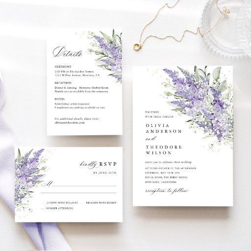 Soft watercolor lavender florals paired with muted greenery create a refined, romantic look—perfect for garden weddings, outdoor ceremonies, and timeless formal celebrations.