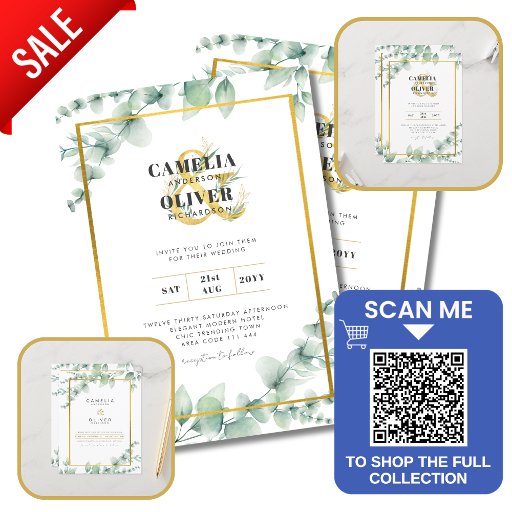 LeahG Eucalyptus Greenery Gold WEDDING QR CODE Inv