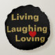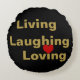 Inspiration "Leben, Lachen und Liebe" schwarz und gold werfen Kissen. Die schwarze Hintergrundfarbe kann vom Kunden geändert werden. Das rote Herz ist vor dem goldenen Herz. Sie können wählen, welche im Design behalten werden soll. Von https://www.zazzle.com/store/celestesheffey