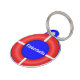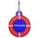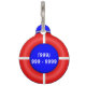 Eine LeuchtorangeSchwimmweste auf einem blauen Hintergrund, mit dem Ihrem Namen des Haustieres im Weiß in der Mitte. Telefonnummer auf Rückseite.