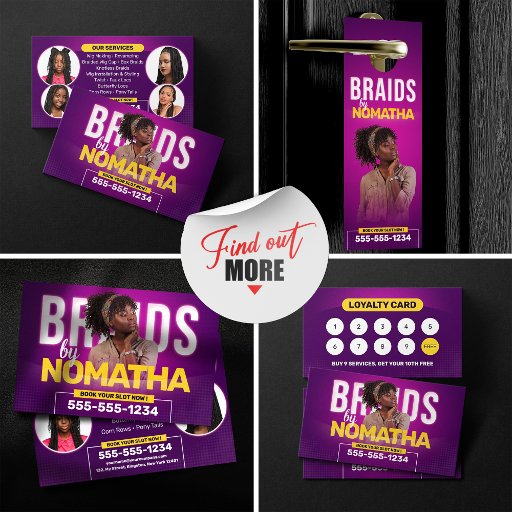 Mit dieser stilvollen und individuell anpassbaren Visitenkarte können Sie Ihr Braiding-Know-how fördern! Zeigen Sie Ihre Dienste, von Kastenbraiden und knotenlosen Braixeln bis hin zur Perückenherstellung und Styling, vorne. Die Rückseite ist mit einem kühnen Design ausgestattet, das perfekt zum Hervorheben Ihrer Marke ist. Bearbeiten Sie den Text, die Fotos und die Schriftart einfach, um Ihren individuellen Stil zu erhalten. ****HINWEIS: Optimale Ergebnisse durch Verwendung eines PNG-Fotos. Wenn Sie auf Schwierigkeiten stoßen, können Sie sich an mich wenden; ich kann Ihnen helfen, Ihr Foto zu beschneiden und Ihnen eine PNG-Version zur Verfügung zu stellen.****