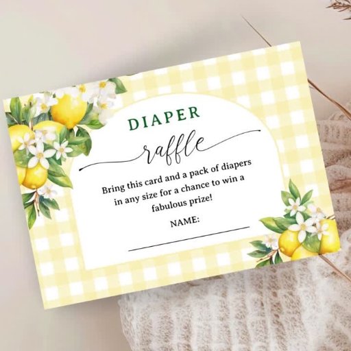 Erhöhen Sie Ihre Babydusche mit unseren "Lemon Citrus Baby Shower Diaper Raffle Cards" und geben Sie Ihren Gästen die Möglichkeit, an der Windeln Raffle teilzunehmen! Geben Sie ihnen die Chance, phantastische Preise zu gewinnen und den Eltern dabei zu helfen, sich auf ihr Freudenbündel vorzubereiten. Verpassen Sie nicht - schnappen Sie sich jetzt Ihre Windeln Raffle Cards und machen Sie Ihre Babydusche noch attraktiver!