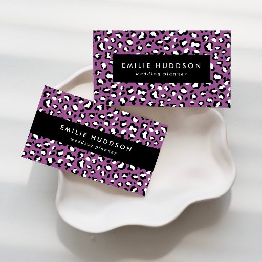 Elegante, stilvolle und raffinierte Visitenkarten mit lila Leopardenmuster. Modernes und trendiges Design, perfekt geeignet für Tierdruckliebhaber.