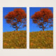 Eine friedliche 3D-Landschaft im Herbst, geschaffen in Vue. Auf einem Hügel, der von einem großen, goldenen Gras bedeckt ist, steht ein einziger orangefarbener Ahorn mit einer Holzbank, um zu stoppen und Erholung zu machen.