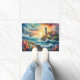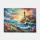 Schöner farbenfroher Garten, Leuchtturm bei Sonnenaufgang in einem blauen Ozean