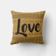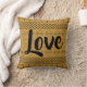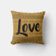 Trendy Aztec geometrische Wurfkissen. Südwestliches Muster mit dem Wort Liebe im Skript. Schwarzer Druck auf ockerfarbenem Hintergrund.