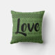 Trendy geometrische Muster werfen Kissen mit dem Wort Liebe in der Schrift. Schwarzer Druck auf dunkelgrünem Hintergrund.