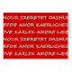Das Wort Liebe in verschiedenen Sprachen. Weiß auf Rot. Niederländisch (liefde), Englisch (Liebe), Deutsch (liebe), Spanisch (amor) Italienisch (amore), Französisch (amour), Dänisch (kaerlighed), Schwedisch (karlek), Hongarisch (szeretet), Albanisch (dashuri)