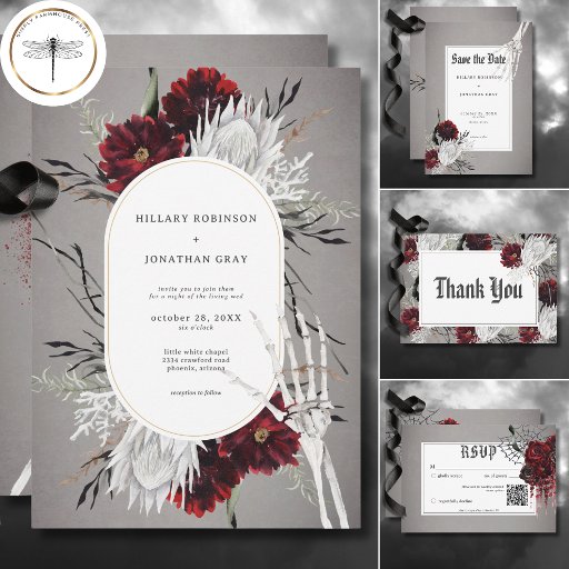 Enthüllt die Verzauberung ewiger Liebe mit unserer spöttischen Hochzeitskarte. Erleben Sie den weltlichen Reiz dieses blutroten und geistreichen, blühenden, weißen Aquarellbildes, das in das göttliche Greifen der skelettalen Hände geknallt ist und eine Geschichte zeitloser Romantik flüstert. Der ätherische Hintergrund, berührt mit einem geistreichen Unschärfe, Set die Bühne für eine Feier, die über den normalen. Wenn Sie die Einladung entfalten, spüren Sie die Spannung, wenn zwei überlappende Knochenhände ein blutrot gestopftes Herz klammern - ein Emblem der Liebe, das selbst den Bereichen jenseits der Grenzen trotzt. Es ist eine Verbindung zwischen dem Mysteriösen und dem Romantischen, die einen zu einer wunderschönen Gewerkschaft zwingt. Dürfen Sie Ihren Hochzeitstag zu einem unvergesslichen Erlebnis machen wie kein anderer! Es wurde von Simply Farmhouse Press erschaffen und ist Teil der Hochzeitssuite "Liebe & Bones Spooky Red Floral".