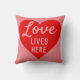 Eine optimistische Botschaft auf einem Kissen, auf dem steht: "Liebe lebt hier". Rot und Rosa, mit einem großen Herz als Hauptmotiv. Rosa Kissen.