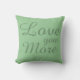 Trendy Throwkissen, Moosgrünkissen mit "Liebe Ihnen mehr" im dunkelgrünen Skript auf der Front, Rückseite des Kissens hat weiße "Polkapunkt" Herzen auf Moosgrünhintergrund zerstreut.