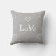 Liebe Text und Sterne auf grauem Kissen.