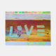 Liebe Hippie böhmische boho Fußmatte. Hellgrüner, rosa, gelber Rost, kupferne Farben. Wort "LIEBE" gemalt auf Holz. Erlöschen Sie in Art mit diesem bunten, Chic, trendy, cooles, modernes Wohngestaltungeinzelteil.