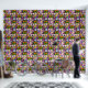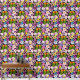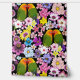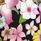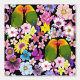 Zwei Liebesvögel auf einem Baumzweig mit rosa, gelben, weißen und violetten Blumen in schwarzem Hintergrund