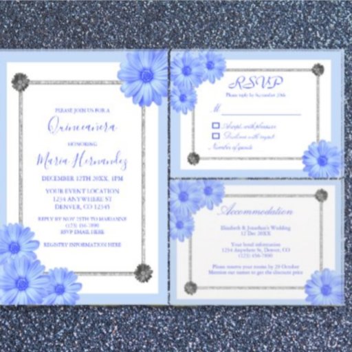 Elegantes, hellblaues Blumendesign, das leicht für eine Quinceanera- oder andere Party-Veranstaltung personalisiert werden kann