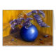 Lila Blumen im blauen Vasen-und Goldhintergrund