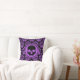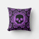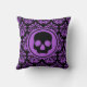 Ein eleganter Dekorator Kissen in schwarz und lila Damast mit einem schwarzen zähligen Schädel in der Mitte. Hübsch gotische Dekoration zu Halloween oder zu jeder Zeit.