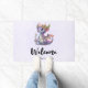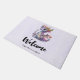 Begrüßen Sie die Tür mit einer Illustration eines mythischen Drachen. Lila und blaue Waage. Eine geblümte Goldkrone mit Hörnern schmückt den Kopf. Magisch, lustig und freundlich.