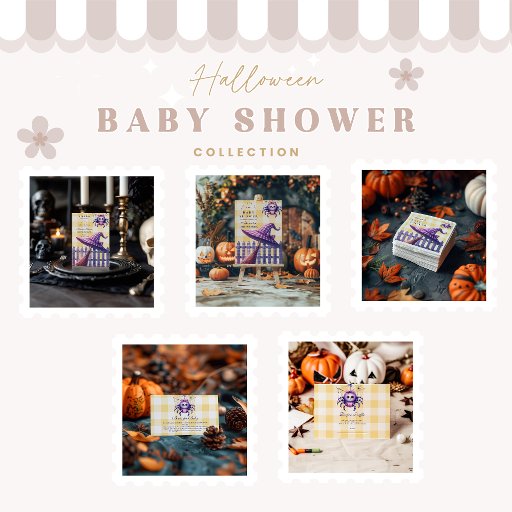 Feiern Sie Ihr kleines Boot mit diesem charmanten Halloween-Baby-Duschdesign! Mit einem gemütlichen Gingham-Hintergrund, einem lila Hexenhut, einem Holzbesen und einer beugten Spinne, die über einem Heftzaun hängt, verbindet diese Einladung Lustig mit Süß auf die richtige Art und Weise. Ideal für ein skurriles Herbstgeburtshaus voller Wärme und Magie.