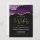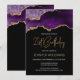 Diese elegante 21. Geburtstagseinladung zeigt ein Aquarellbild einer Age-Geode in lila Farbtönen mit Imitaten und goldenen Highlights. Die Worte "21. Geburtstag" erscheinen in Imitaten goldener Glitzer in dekorativen modernen Handschrift Schriftart. Passen Sie ihn an mit dem Namen des Ehrengast in goldfarbenem Text und den Details in weiß. Auf der Rückseite wird das selbe lila Agate-Bild angezeigt.