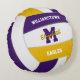 Dieses sportliche Team farbt Volleyball Rundkissen und zeichnet sich durch ein realistisch aussehendes lila, goldfarbenes und weißes Volleyball aus, auf dem man den Spielernamen, den Monogramm- oder Varianzbuchstaben, den Mannschafts- und Maskottnamen auf der Vorderseite und die Trikotnummer auf der Rückseite - von katz_d_zynes