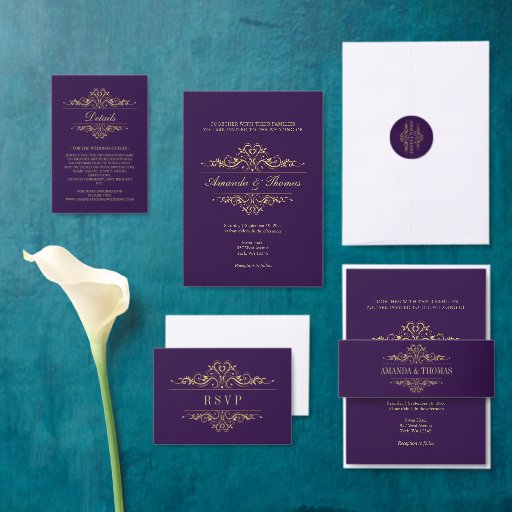 Lila Hochzeit mit goldenem Rahmen Einladung