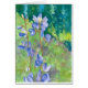 Eine hübsche Notizkarte mit einem Blumengemälde in Aquarellfarben mit lila Lupine-Wildblumen, die auf einem Wildblume-Hügel wachsen und im Hintergrund tiefgrüne Bäume bilden.