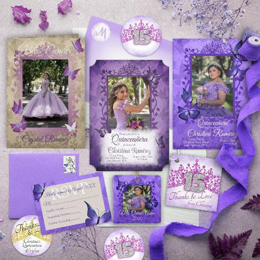 Dieses elegante lila Schmetterling Quinceanera mit dekorativem, antiken Foto-Rahmen ist vielseitig für dunkle lila, helle lila, Lavendel-Party-Themen. Morado lila quinceanera Budget Vorlage ist leicht zu ändern. Ideal für morado mis quince Party Themen.