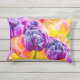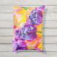 Lila, gelbe und orangefarbene Tulpe-Blume auf einem blumengeschmückten Federbett. Alle Regenbogenfarben sind vorhanden. Kissen im Freien für jedermann.
