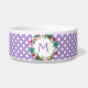Weiße Keramik Hundefutter / Wasserschüssel in lila mit weißen Polka Punkte getan. Ein hübscher Rundblumenkranz hat ein blauer 1-Buchstaben-Monogramm, das für Ihr Haustier oder als Geschenkidee für jeden Tierbesitzer personalisiert werden kann.
