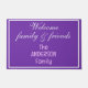 Willkommensfamilie und Freunde sind in weißem Schriftsatz geschrieben. Hübscher violetter Hintergrund mit weißem geometrischem Rahmen. Geben Sie Familiennamen in lila Farbtypografie ein. Klicken Sie auf Schriftart-, Hintergrund- und Textfarben anpassen und ändern. Original Designs von TamiraZDesign.