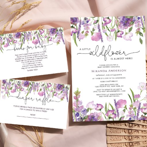 aquarellverlosungskartebabypartyelegantwindelverlosungblumenreichblumelilawildblumelavendel
