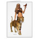 Dieses Design zeigt ein Fantasiebild einer wunderschönen alten Kriegerkönigin, die mit ihren Gefährten spazieren geht, einer goldenen Löwen und einem kleinen roten Vogel.
