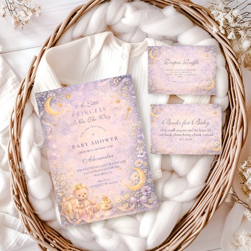 Celebrate a sweet arrival with this dreamy Little Princess baby shower design, featuring a soft celestial scene filled with moons, stars, delicate florals, and golden crown details. The pastel lavender and blush tones create a magical, storybook atmosphere that feels gentle, elegant, and timeless. Perfect for a princess-inspired celebration with a modern, whimsical touch, this design is ideal for creating a warm and enchanting moment to welcome baby.