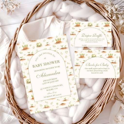 Celebrate a sweet new beginning with this charming little sprout themed design, featuring delicate garden illustrations, soft greenery, and a warm neutral palette. The gentle botanical details and whimsical vegetables create a cozy, storybook-inspired feel that’s perfect for a nature-loving mama-to-be. Designed with a clean arched layout and elegant typography, this piece blends rustic charm with a refined aesthetic. Ideal for spring gatherings, garden parties, or anyone who loves a soft, organic look.