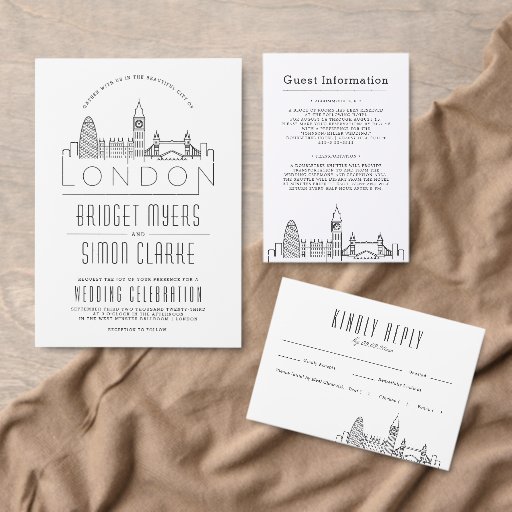 Eine einzigartige Hochzeitstasche für eine Hochzeit in der schönen Stadt London. In dieser Tasche wird die einzigartige Skyline der Stadt mit ihren Gebäude und Sehenswürdigkeiten unter ihrem Namen stilisiert. Anschließend erhalten Sie Informationen zu Ihrem Hochzeitstag in einem passenden, offenen Stil.
