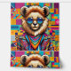 Das Bild ist eine digitale Illustration eines Löwen, der in stilvoller Weise gekleidet und in der Mitte vor einem lebendigen und farbenfrohen geometrischen Hintergrund stehend ist. Das Tier hat eine runde Sonnenbrille mit blauen Linsen und eine Jacke mit bunten geometrischen Mustern. Die Pose und das Zubehör des Tieres legen ein cooles und selbstbewusstes Verhalten nahe. Die Kulisse besteht aus einem kaleidoskop von Farben, darunter Gelb, Rot, Blau, Orange, Braun und Grün, bestehend aus verschiedenen unregelmäßigen geometrischen Formen, die zu einer lebhaften und dynamischen Atmosphäre beitragen.