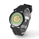 Diese phantastische Uhr zeigt ein grafisches Bild einer Goldmünze mit zwei Goldtönen. Der äußere Kreis hat eine grobe Textur. Im inneren Kreis der Münze befindet sich ein goldfarbenes Kleeblatt, bestehend aus 3 Blätter und einem Stamm.