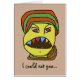 Cartooncharakter, der nicht zu nett schaut. Gelbe Haut, lila Augen, bunte Zähne. Schwarzer Druck "ich könnte Sie essen…". Text innerhalb der Karte: "… oder ich könnte gerade sagen HALLO!". Text kann redigiert werden.
