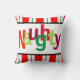 Sind Sie frech oder nett? Dieses bunte Kissen liest "freches" in der modernen Typografie auf einem weißen Hintergrund mit einer Grenze der schwarzen Kamm-Muscheln und des roten, weißen und grünen gestreiften Musters. Macht einen Spaßzusatz zu Ihrem Feiertagsdekor! Ein zusammenpassendes "Nizza" Kissen ist auch verfügbar. Entworfen durch Künstler © Tim Coffey.