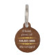 Give your pet a stylish, timeless look with this elegant leather‑look pet ID tag. The front features a rich brown faux‑leather background with your pet’s name centered between two refined decorative flourishes, creating a classic and upscale feel. The back includes fully customizable safety information such as “If found, please call,” your preferred phone number, and important details like “microchipped,” “tattooed,” or any other notes that help bring your pet home quickly.