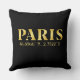 Das Throw-Kissendesign zeigt die Koordinaten der Breiten- und Längenkarte von Paris, Frankreich, in goldenem Text auf schwarzem Hintergrund.