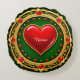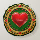 Ein verziert ovaler, goldfarbener Rahmen mit aufwändigen Mustern und roten Edelsteinen umschließt ein pulsierendes rotes Herz. Der Hintergrund zeichnet sich durch eine reiche tiefe greeb-Farbe aus, die das glamouröse und regale Design unterstreicht.