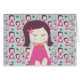 Niedliches, lustiges, skurriles, farbenfrohes Design auf Gegenständen wie Brieftaschen, Uhren, Karten, Aufkleber, Zugschnürbeutel, kompakten Spiegeln, Schlüsselketten, Notebooks, Büchern, Bindemitteln, Kissen und vielem mehr. Kleine Mädchen mit rosa Herzkleider, mit rosa und weißem Polka gepunkteten Handtaschen, dunklen lila Sternen und einem blauen Zickzack Streifen-Hintergrund.
