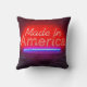 Ein Neonzeichen leuchtet mit den Worten "Made in America" in fett rot und blau an einer Ziegelwand