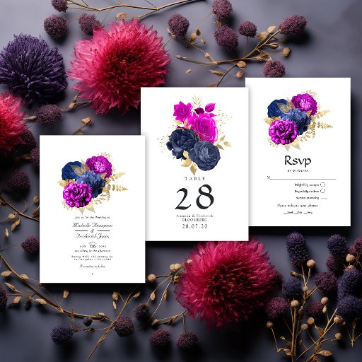 Magenta Marine und Gold Blumen Hochzeit Einladung mit Akzenten von rosa. Ideal für jede Art von Thema oder Gartenhochzeit. Der QR-Code auf der Rückseite führt zu Ihrer Hochzeitsstelle, wo die Menschen mehr und uAwg lernen können.